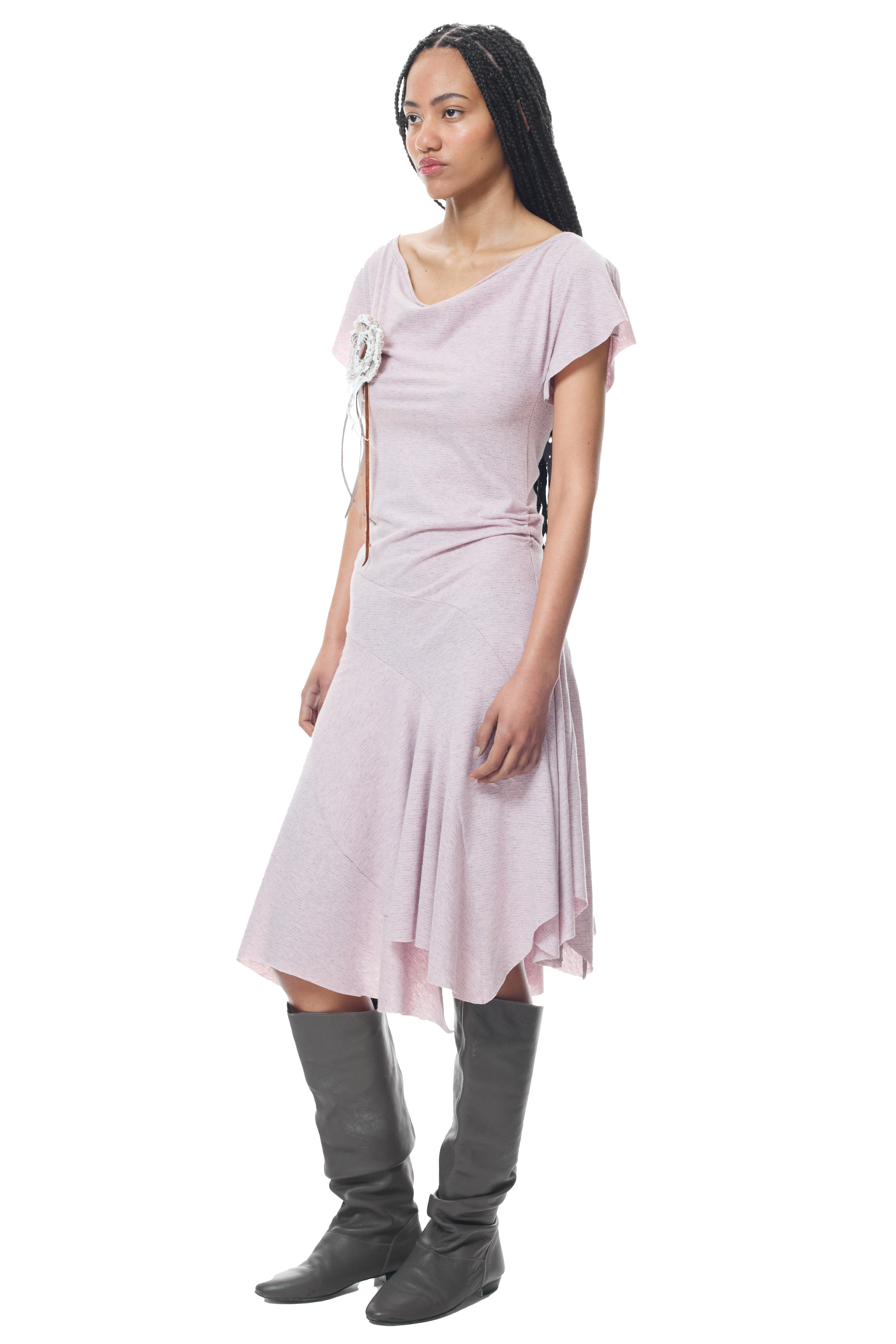 Asymmetrical Paneled bias cut flowy dress. With wide deep neckline that can be worn in different ways. Split short sleeve. And Delicate gathering on the sides.