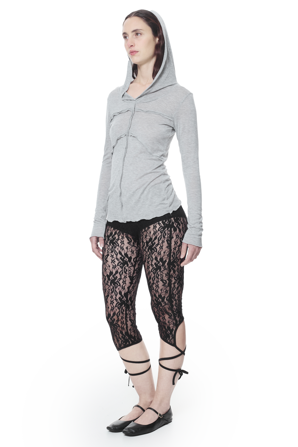 Mid rise gender-neutral stretch semi transparent flower lace capri trousers. with long tendrils along the side to wrap around the legs or tie as a bow.