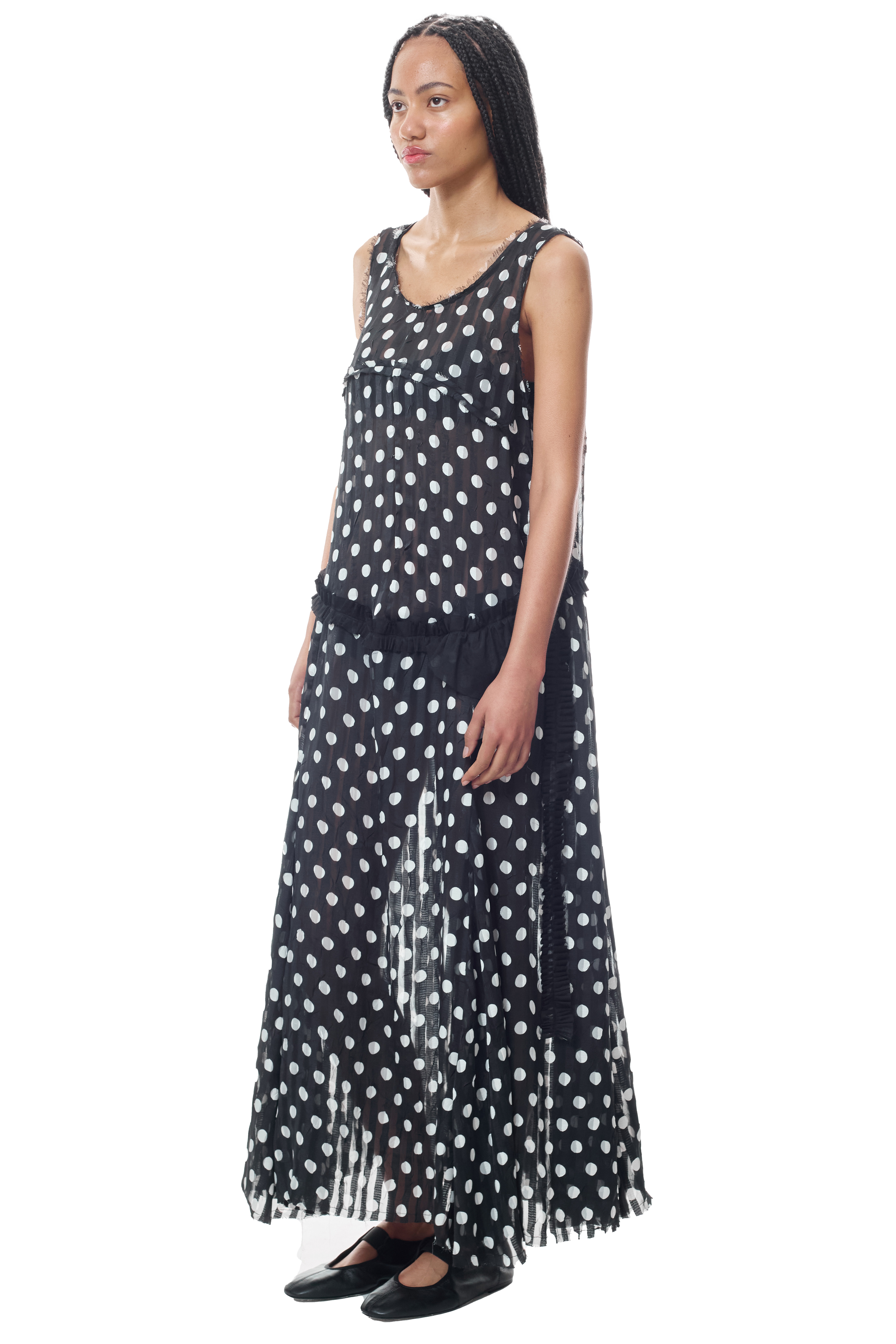 V neck polka dot maxi dress with panelled construction and contrasting godets. Loose comfortable fit. Lighweight semi transparent georgette with inside out seams details. Hipline gathered detail in contrasting Black.
