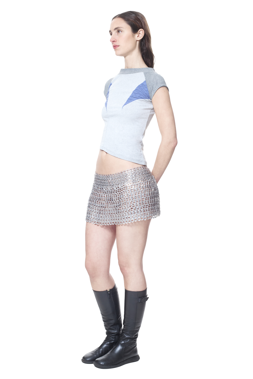 Asymmetric patchwork shortleeve raglan baby tee with signature cuts and boat neck.