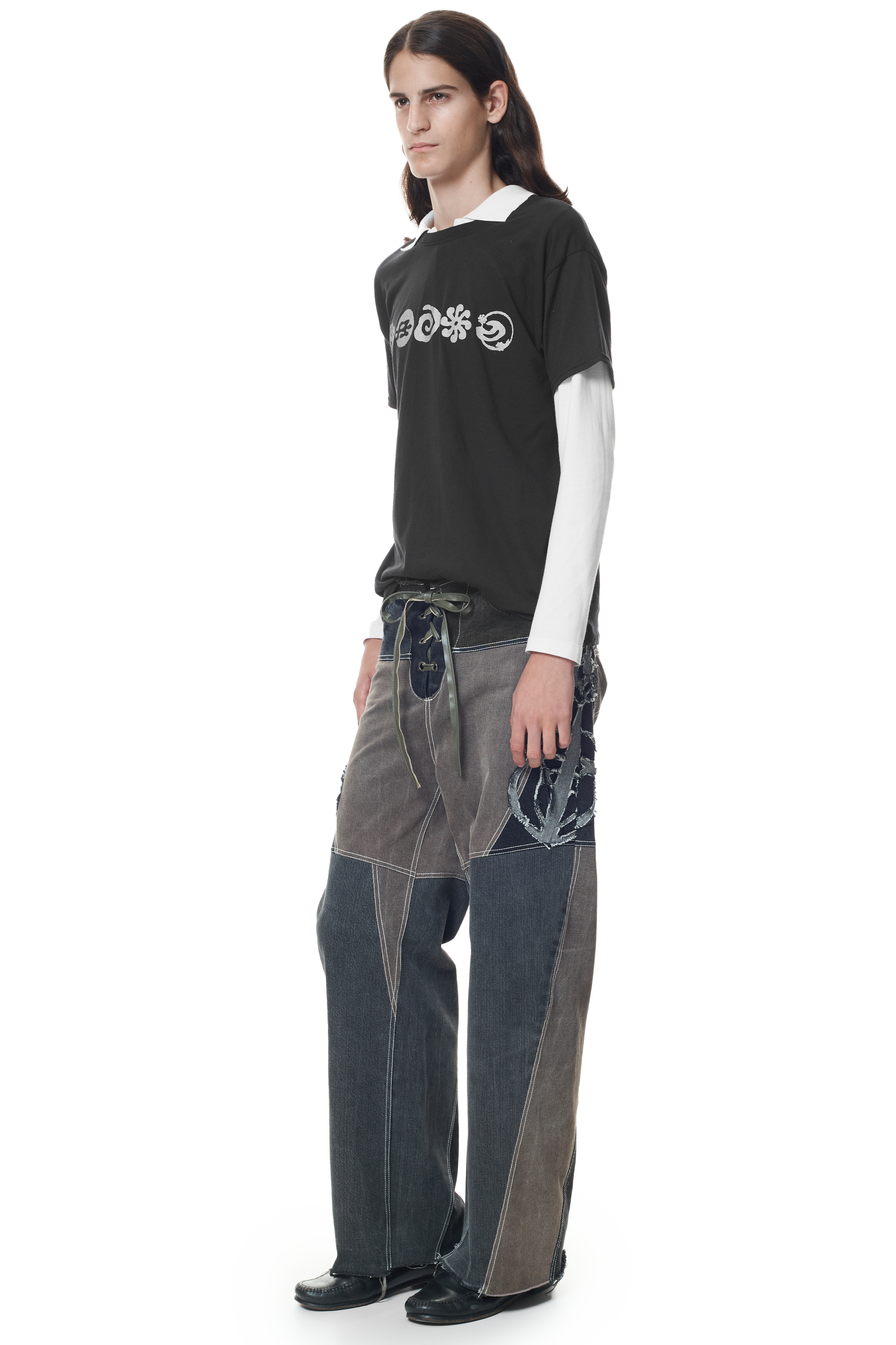 Panelled construction, wide leg fit with opening at the bottom inside of leg. Features three different denim shades and qualities.