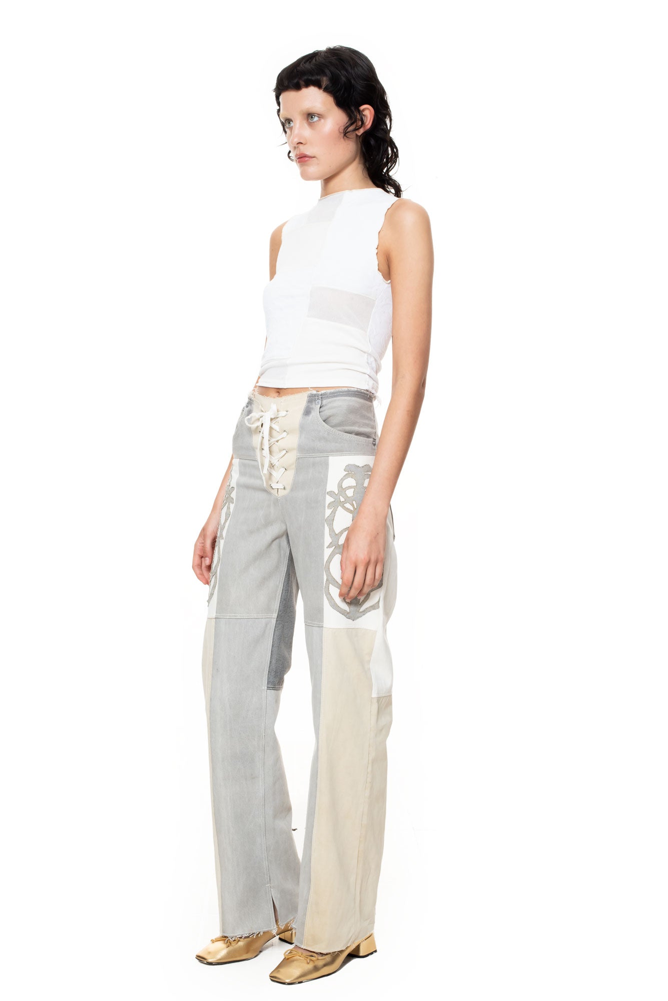 Mid rise gender-neutral up-cycled denim and cotton jeans. Laced up front. Laser cut Lock motif on front legs and Key motif at back pockets.