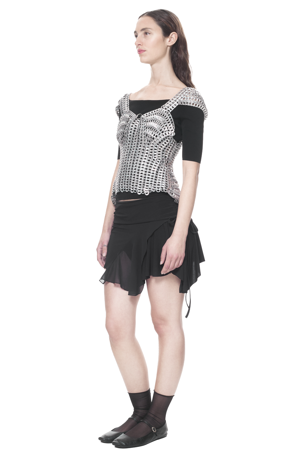 Our silver corset is crafted from more than 1,000 recycled aluminium can tabs. Lightweight, inspired by armour wear, this corset has a central ring and four panels that shape bust and hips and also allow movement and comfort. Crocheted with 100% cotton thread. Black lace tie included.