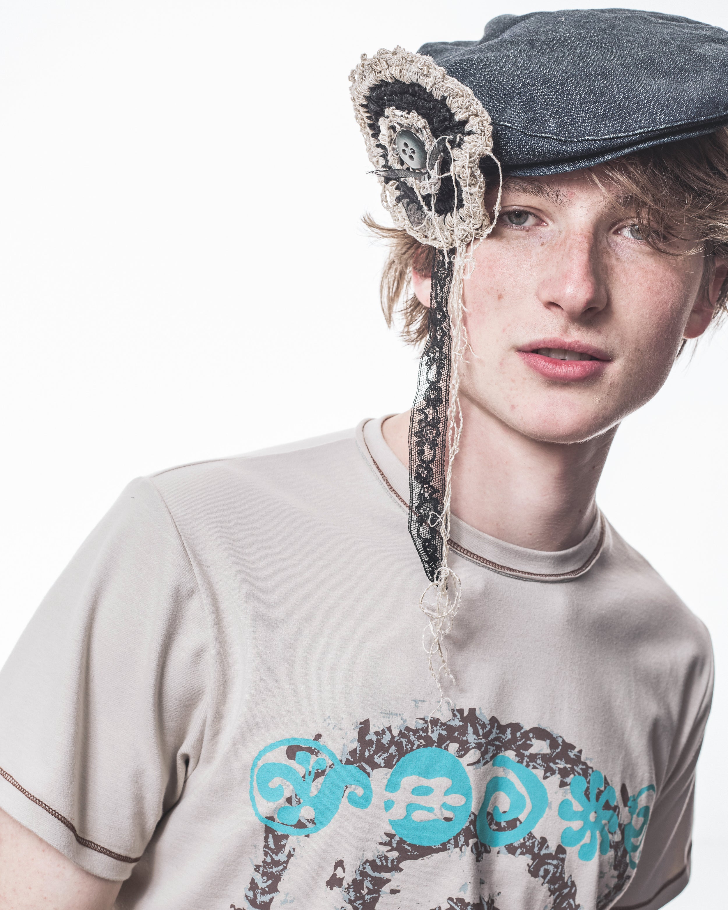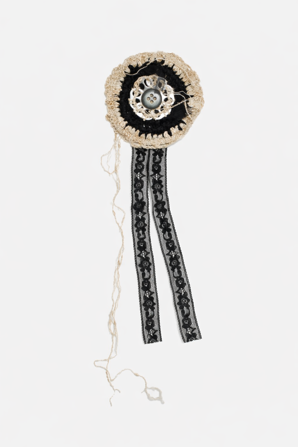 Handcrafted brooch or hair clip made in cotton crochet, incorporating upcycled metal can tabs, inherited family lace trimmings, and found vintage buttons.