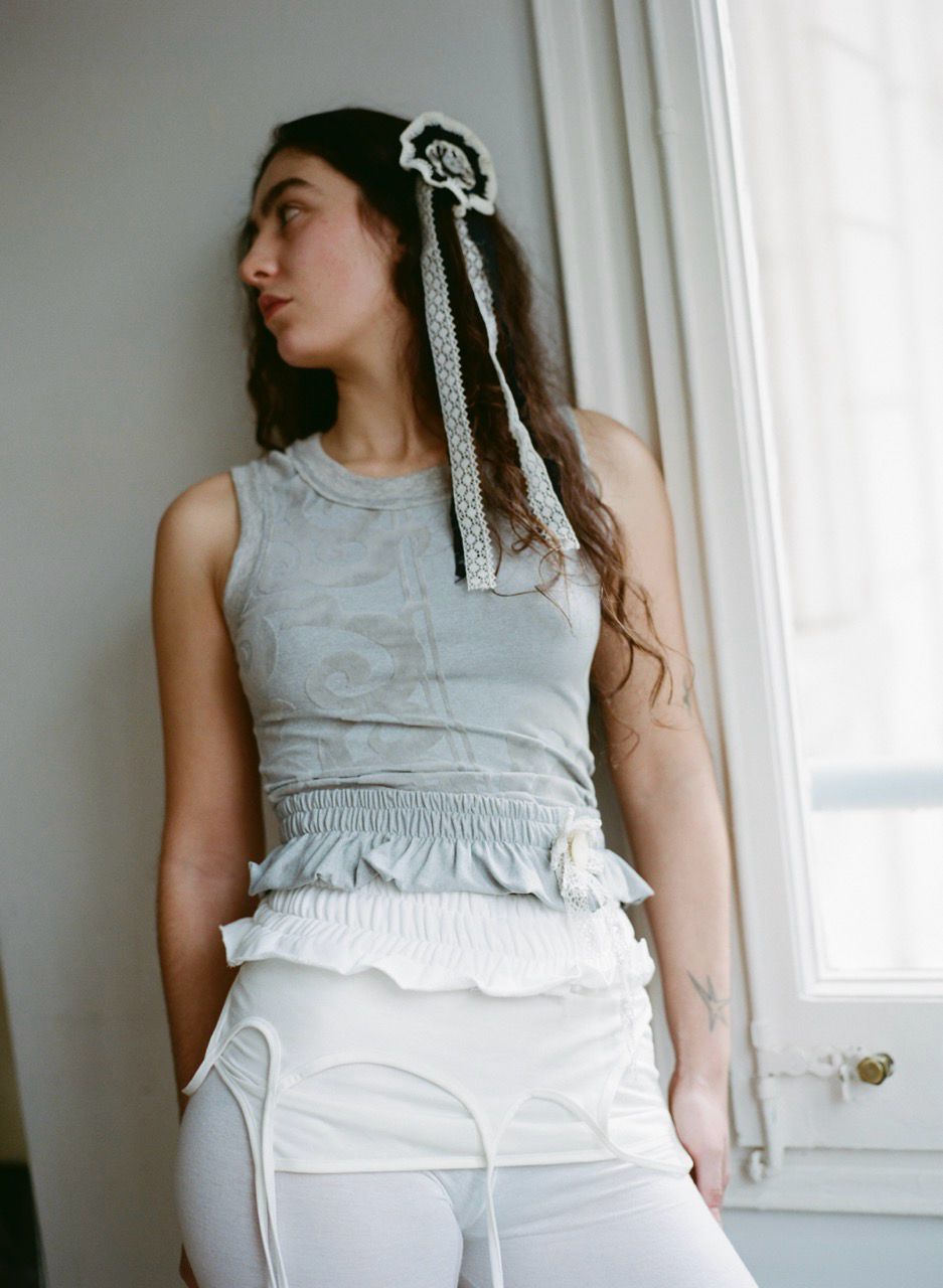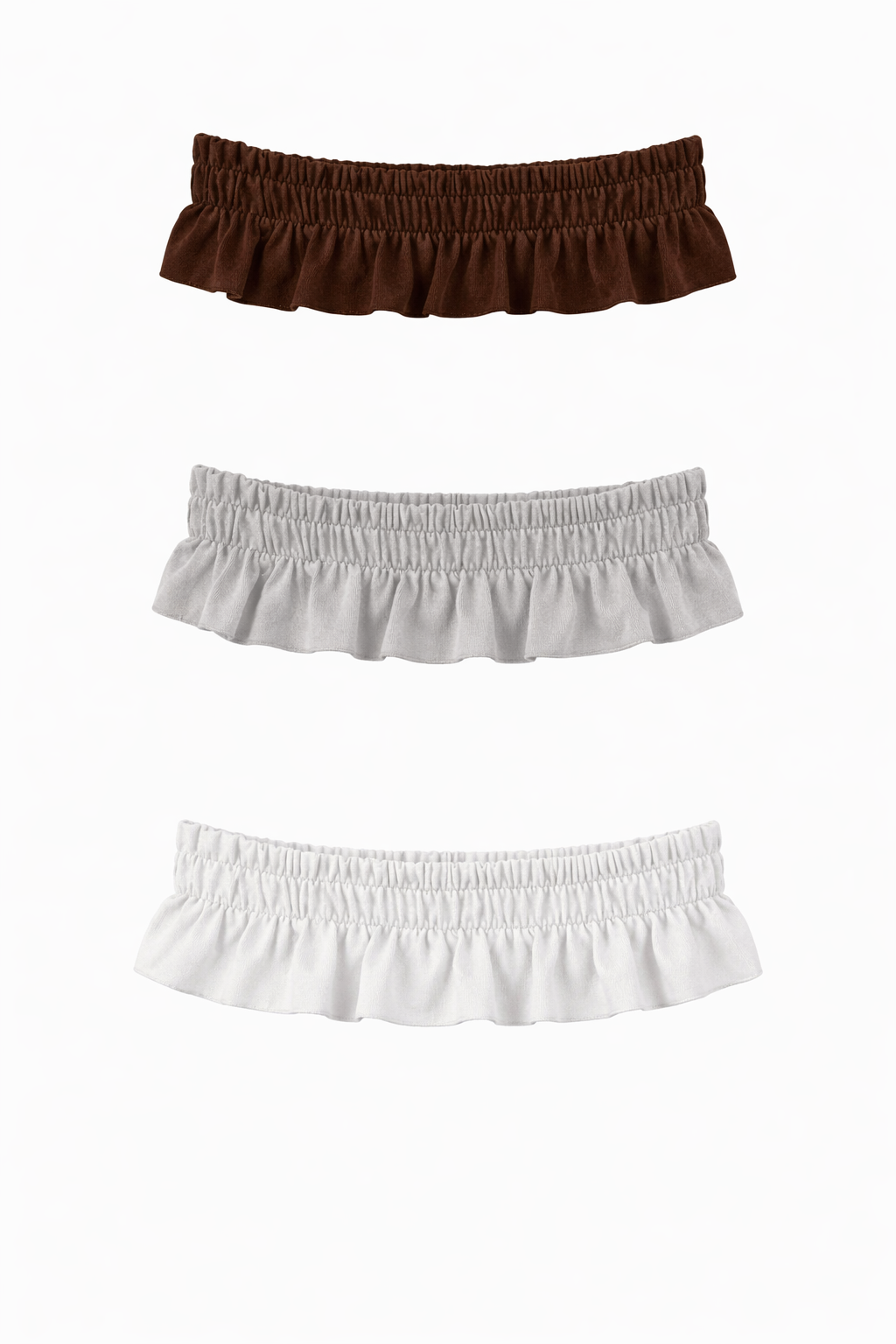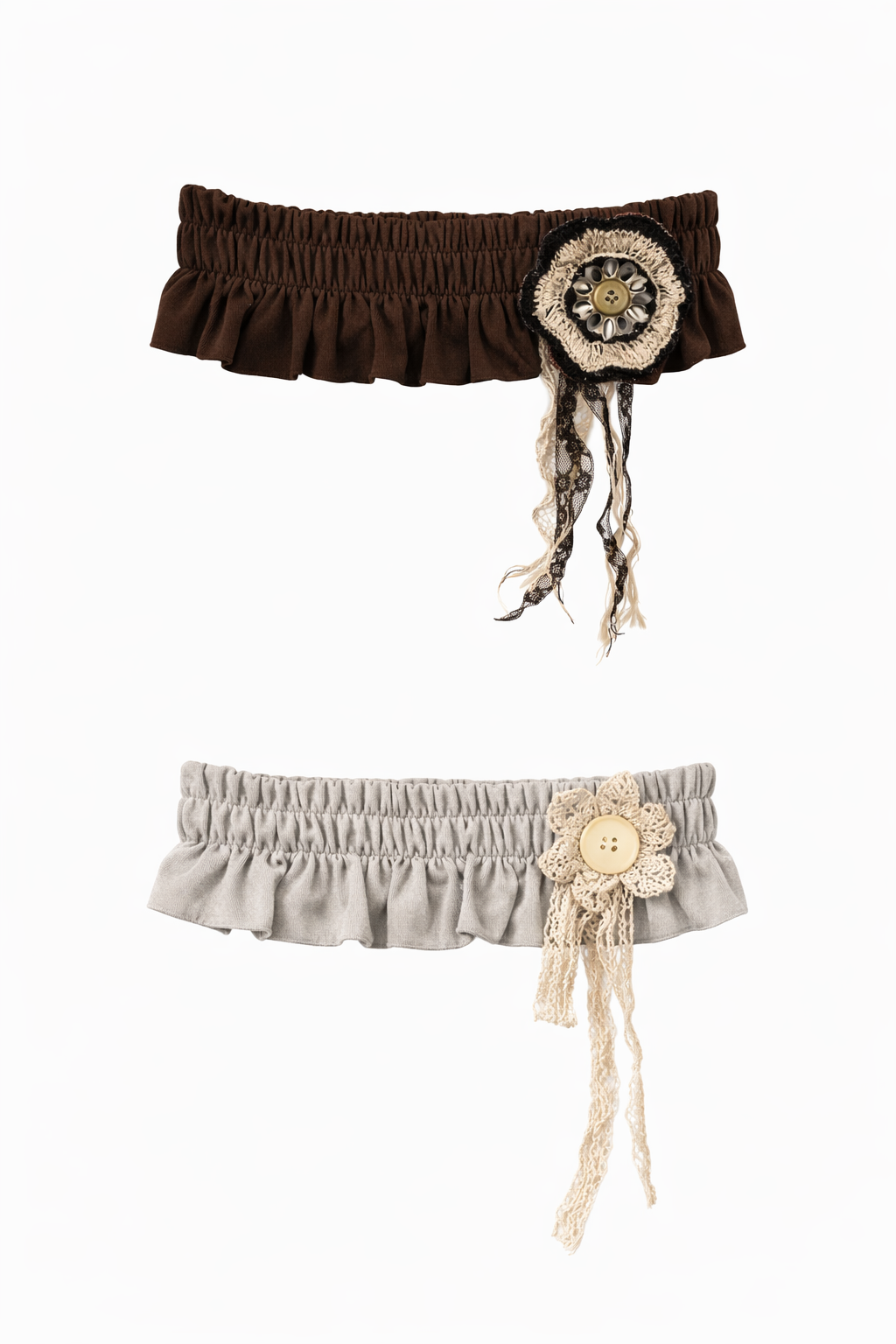 Decorative ruffled belt made from elastic materials. Designed as an ornamental accessory rather than a functional piece, it gently sits on the body as a styling gesture.